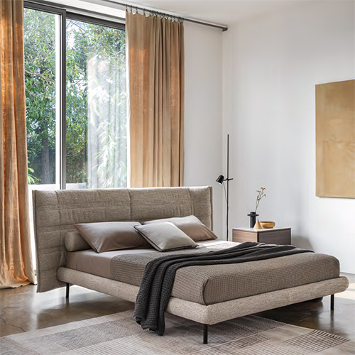 MONBED — кровать, сочетающая в себе комфорт и функциональность, вдохновленная комфортом пухового одеяла. Мягкое изголовье очень большое и создает интересный контраст, с тонкими ногами и каркасом кровати. Оно окутывает, словно обнимает отдыхающих. Обогащен вертикальными и горизонтальными строчками, создающими вдохновляющий графический узор.