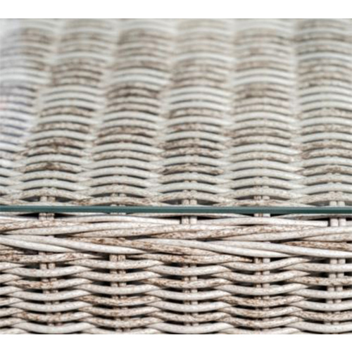 Плетёный корпус в едином стиле, столешница — закалённое стекло толщиной 5 мм.